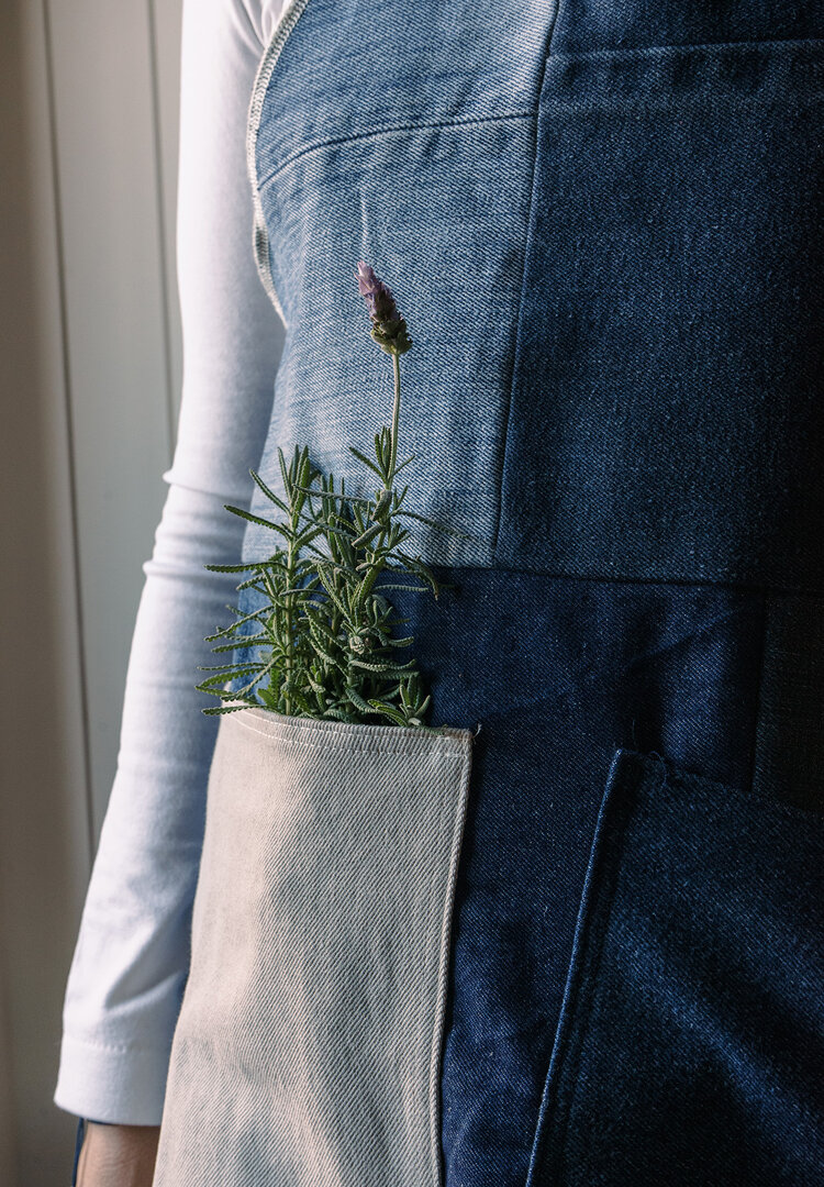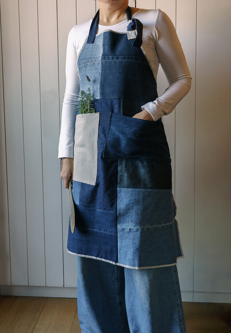 Este delantal está hecho con retales de denim posconsumo reciclado.